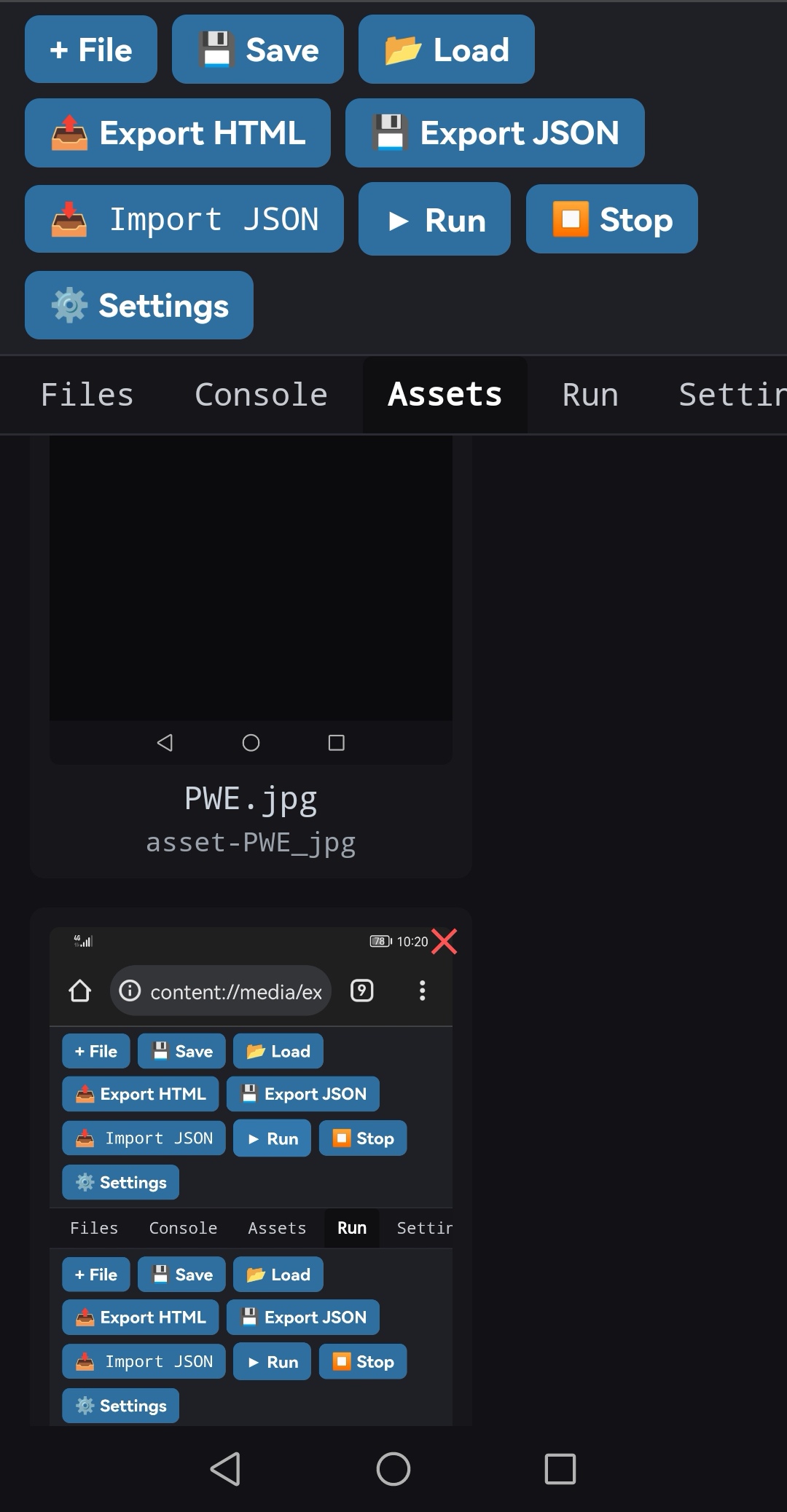 Pocket Web Editor (PWE) is a mobile-first, offline web IDE for creating websites and games directly in your browser. It supports HTML, CSS, JS, and assets like images and audio, letting you edit, preview, and export projects as a single HTML file or JSON for backup.